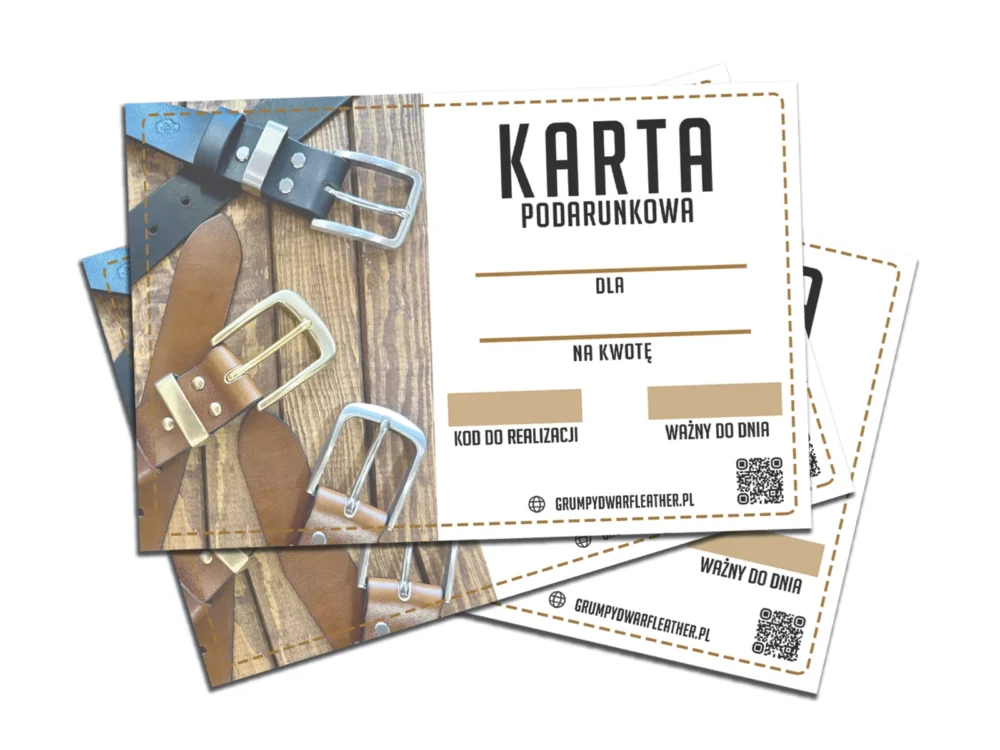 Nasza karta prezentowy na ręcznie wykonane skórzane akcesoria to strzał w dziesiątkę! Osoba której podarujesz ten bon, samodzielnie skomponuje idealny dla siebie pasek! Daj jej wolność wyboru spośród naszej kolekcji ręcznie robionych pasków, portfeli, bransoletek i innych akcesoriów ze skóry.
