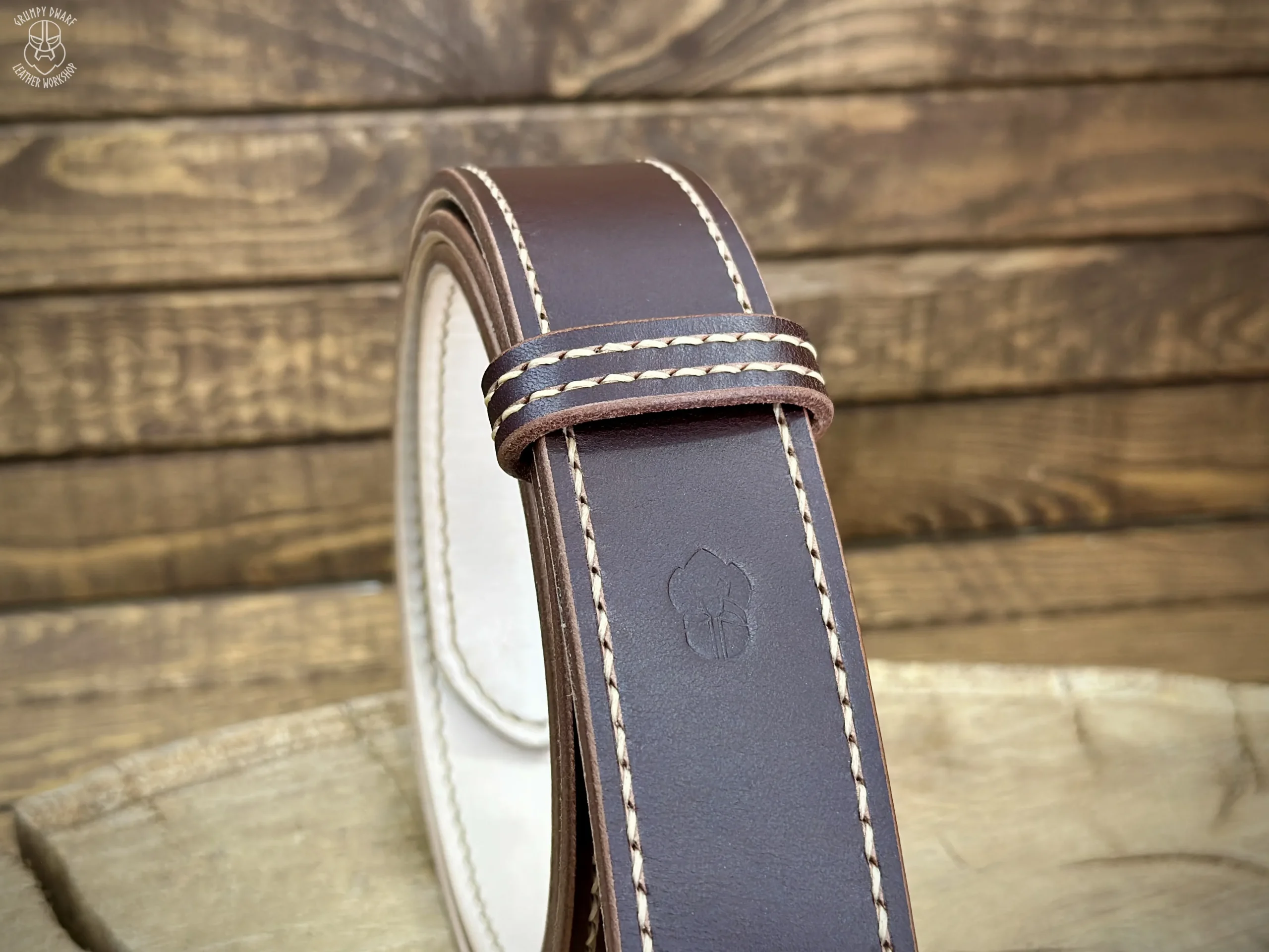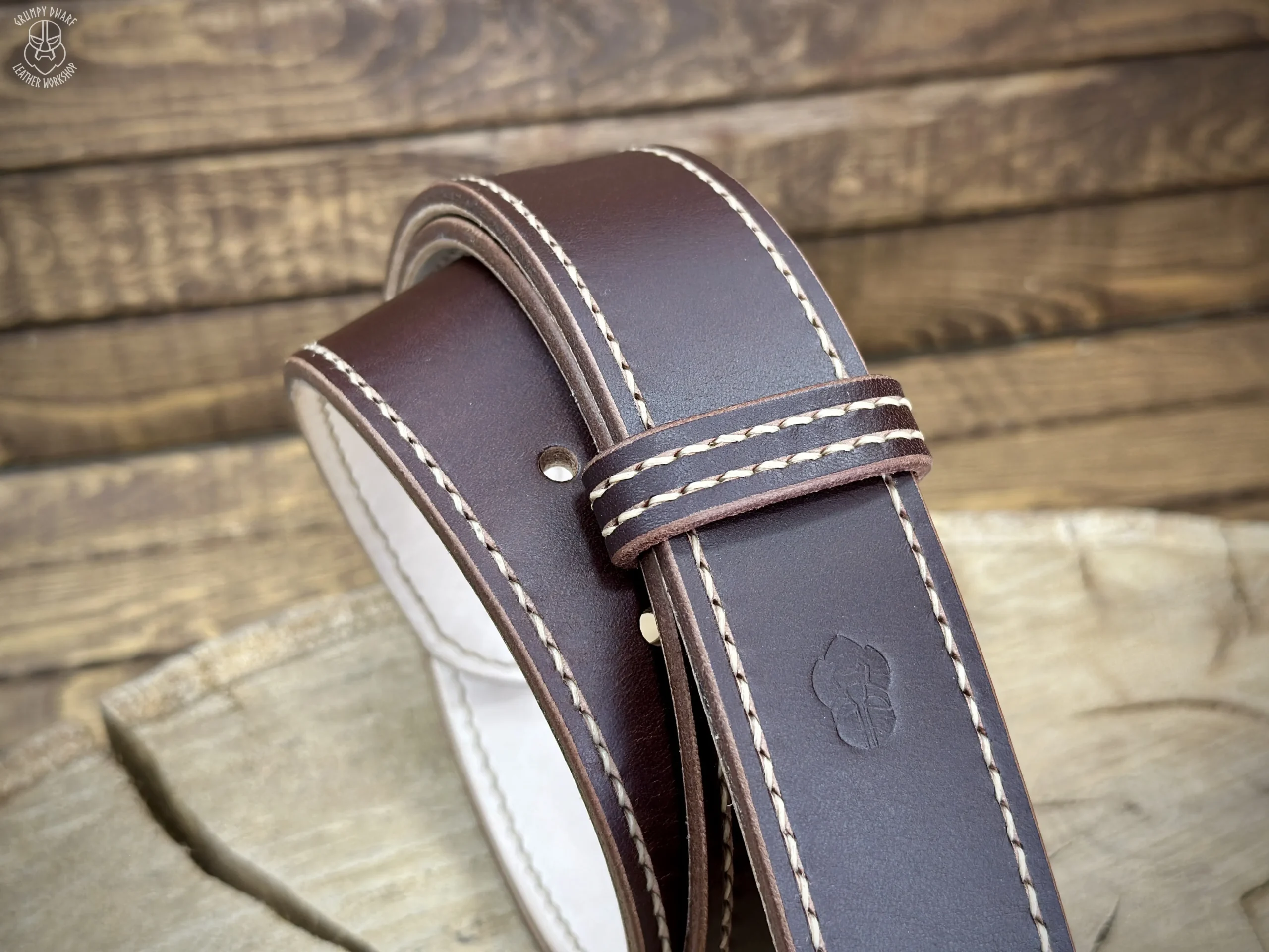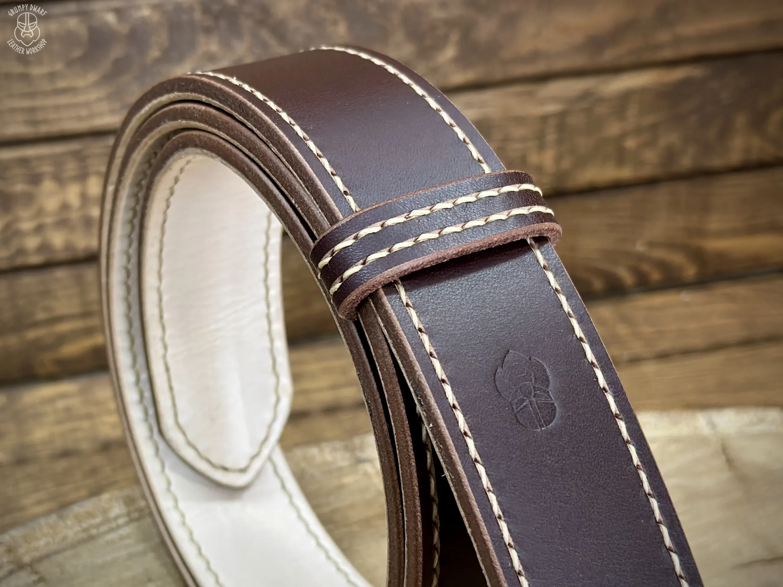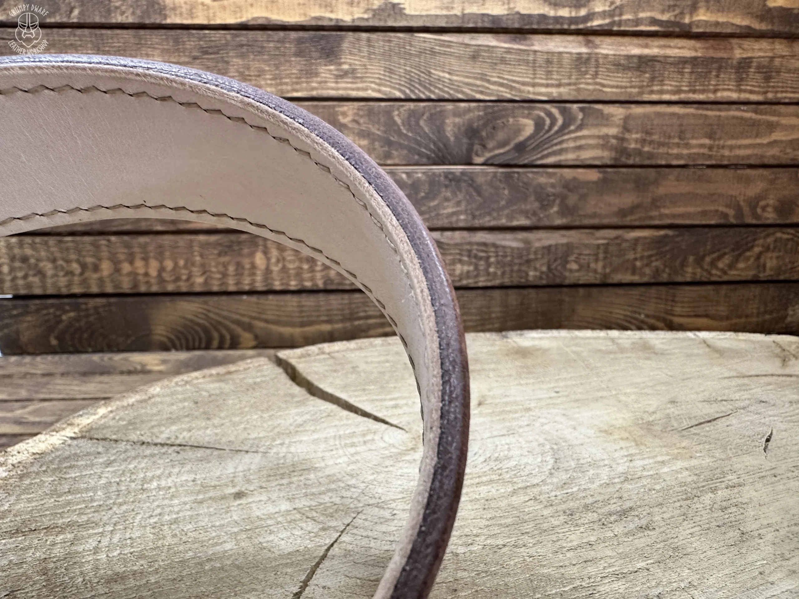 Podszewka paska została przyszyta ściegiem siodlarskim (saddle-stich), co zapewnia szwom o wiele większą trwałość w porównaniu do szycia maszynowego.