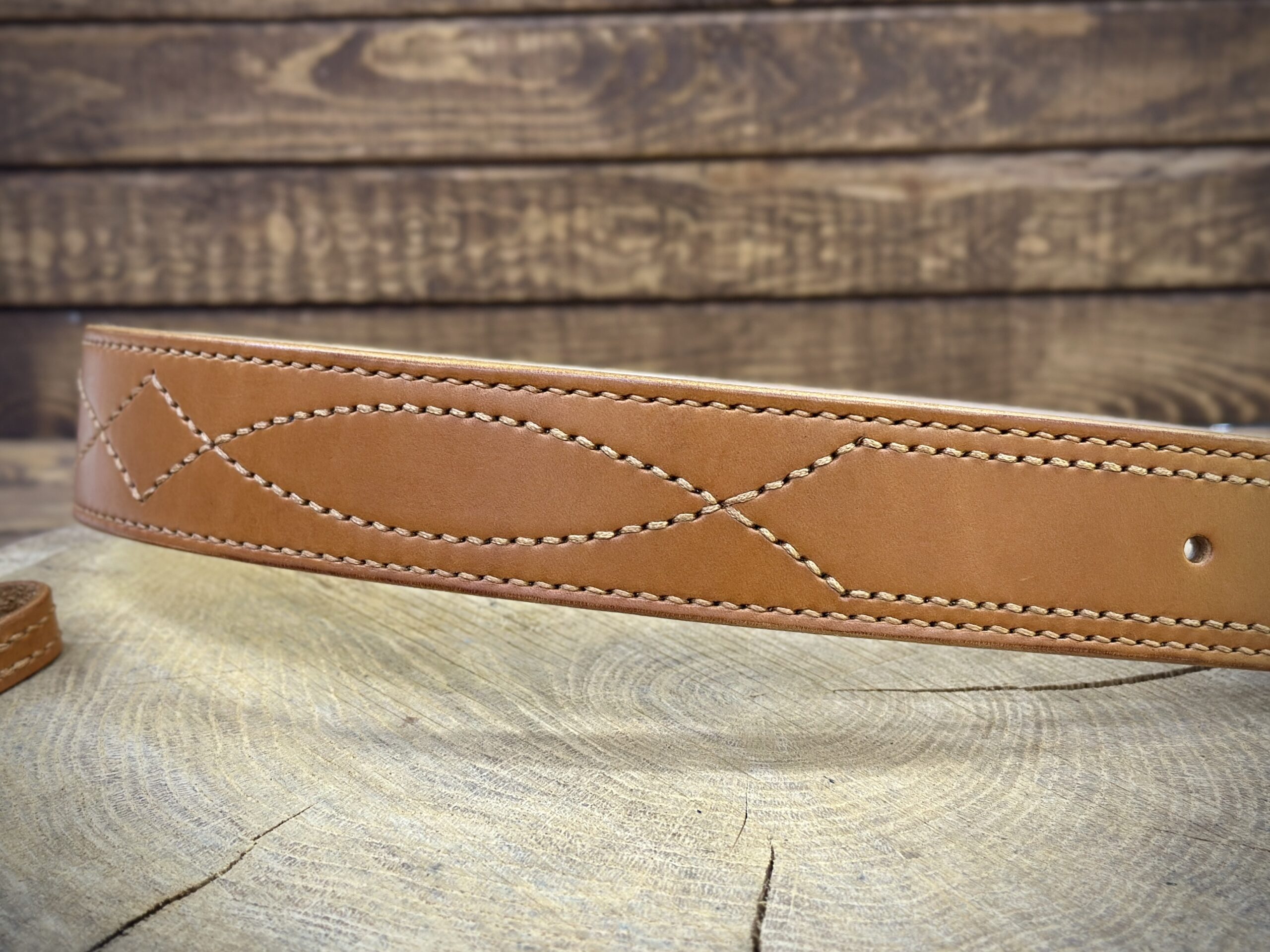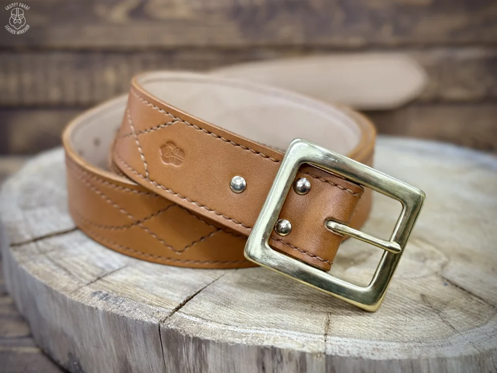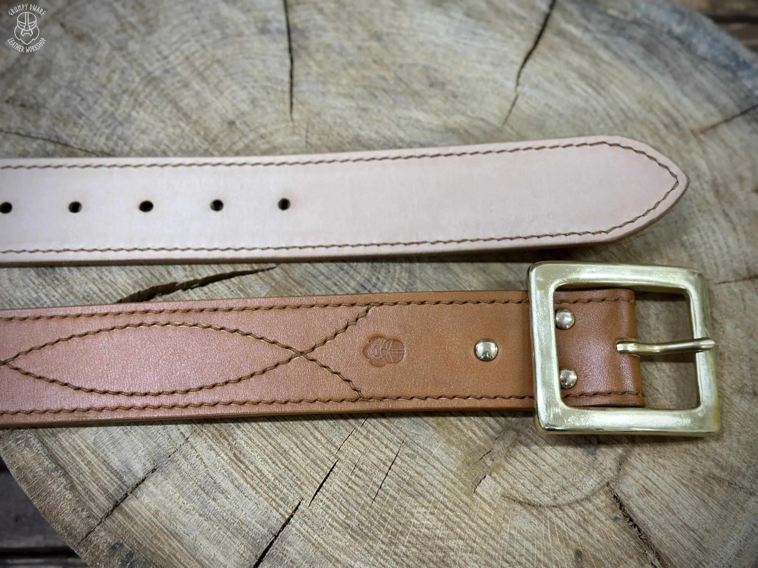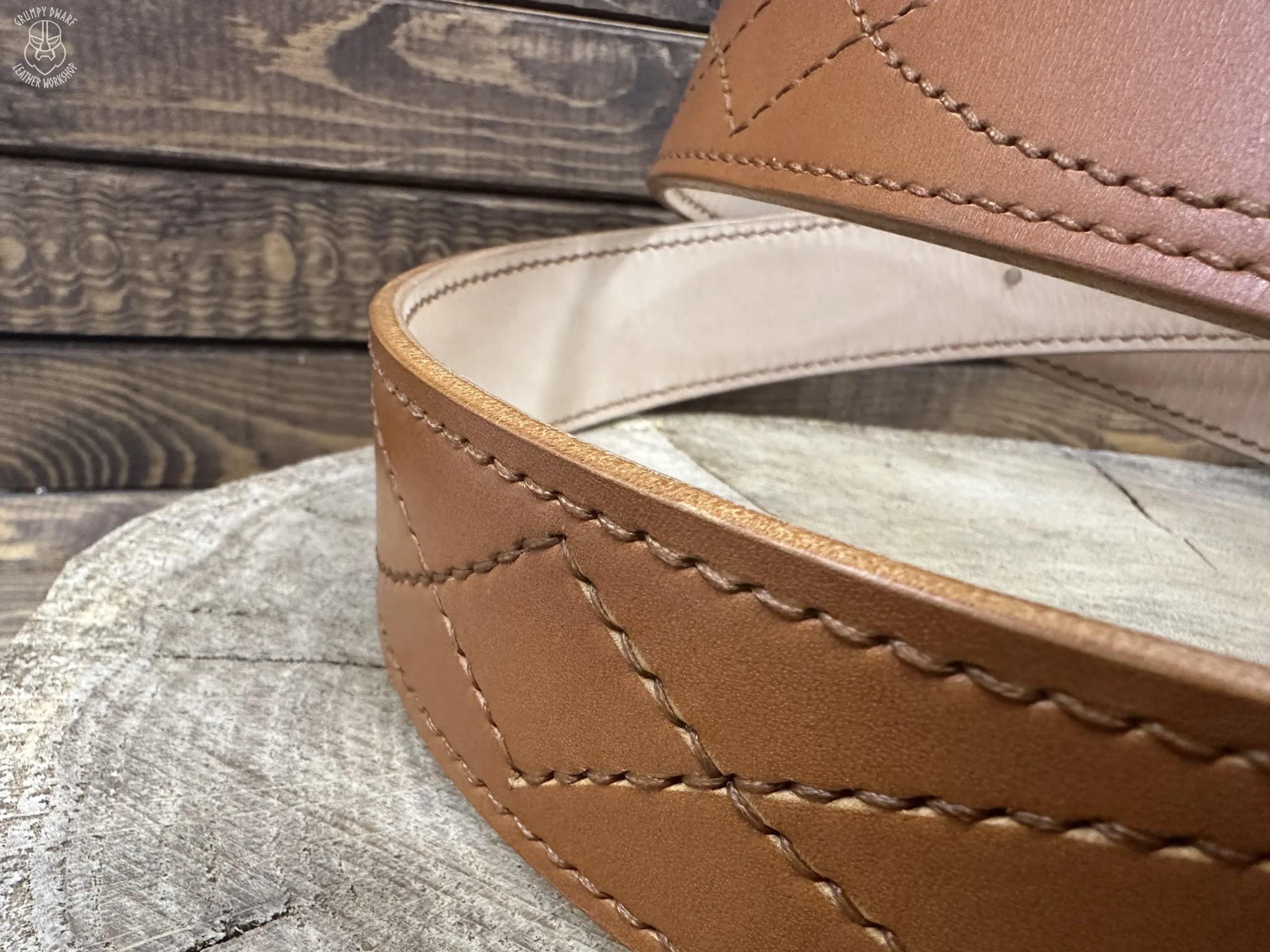 Podszewka paska jak i przeszycia zostały wykonane ściegiem siodlarskim (saddle-stich), co zapewnia szwom o wiele większą trwałość w porównaniu do szycia maszynowego.
